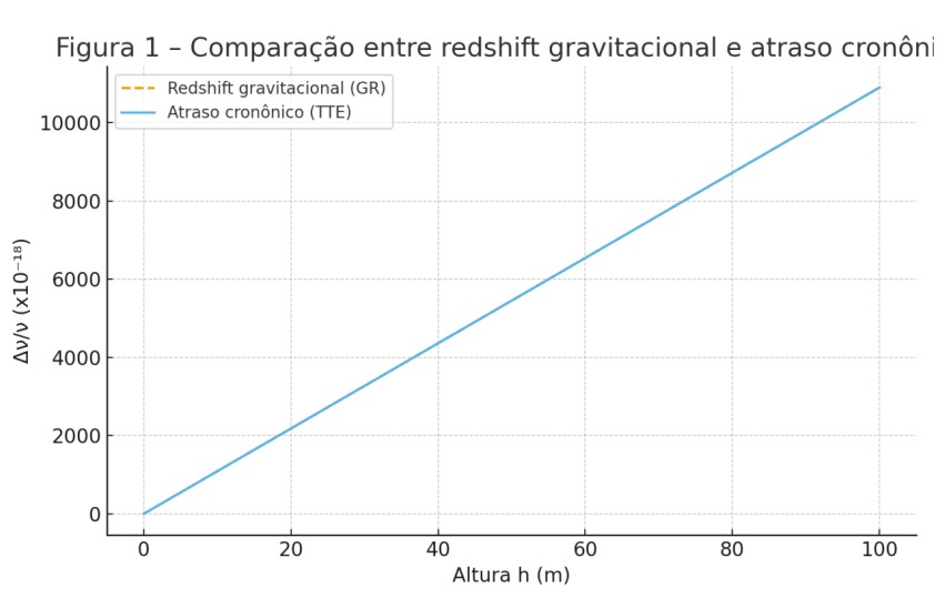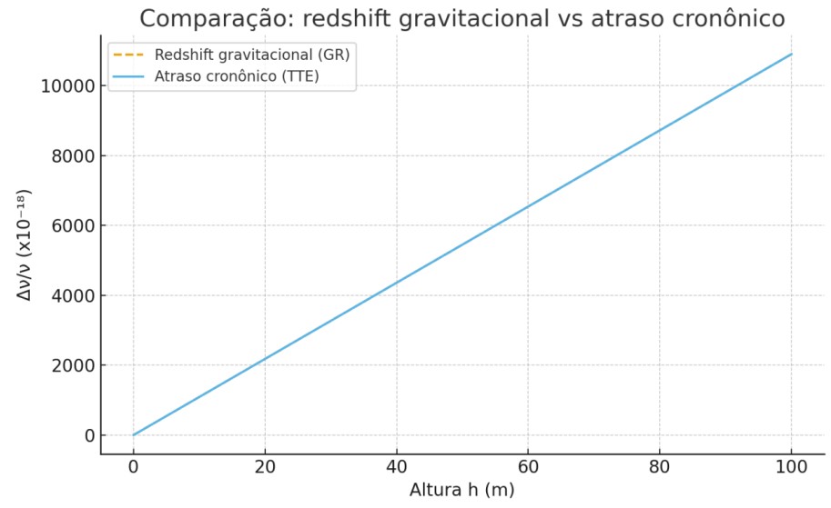 Compara diretamente o redshift gravitacional previsto pela Relatividade Geral com o atraso cronônico previsto pela TTE. As curvas coincidem dentro de um fator de conversão, servindo como evidência da dualidade Gravidade–Tempo.