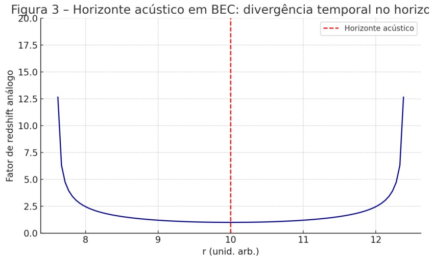 Modelo de condensado de Bose-Einstein (BEC) com fluxo supersônico formando um horizonte acústico. A divergência do fator de redshift no horizonte é equivalente à divergência cronônica em buracos negros, reforçando a interpretação da dualidade.
